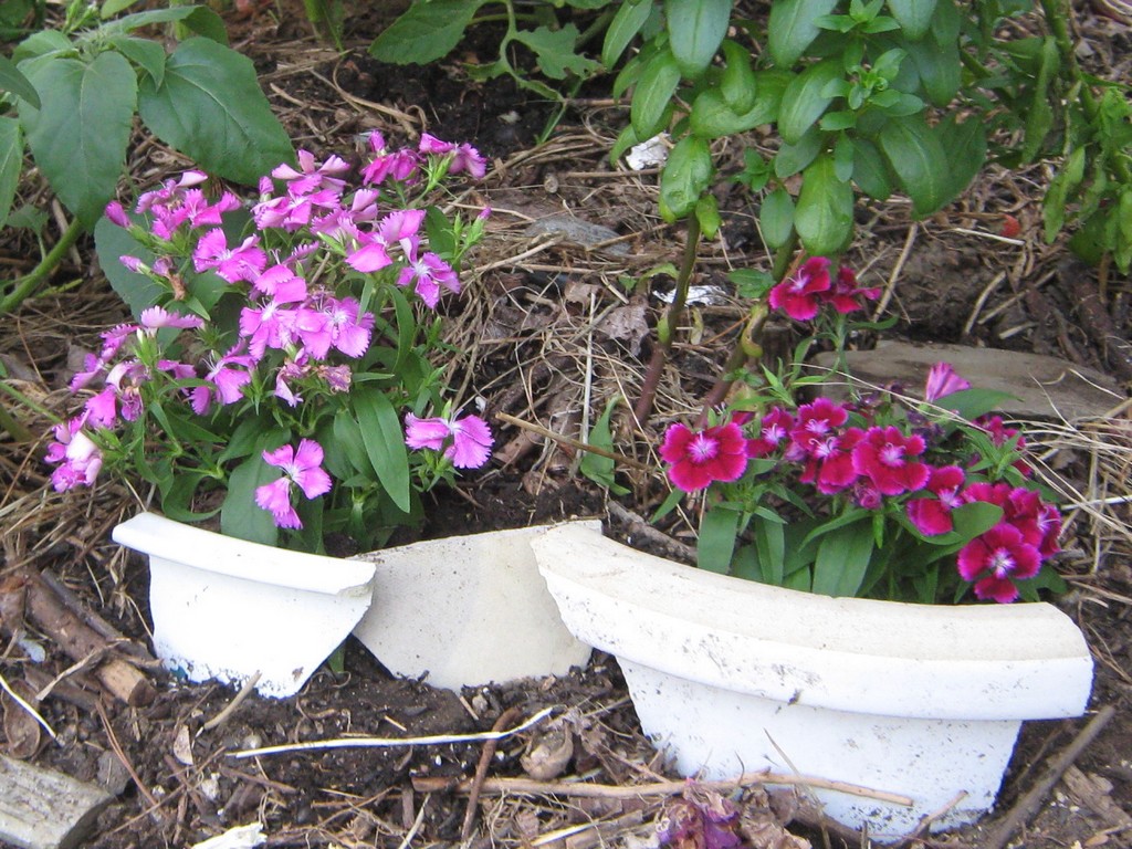 I planted myself some flowers today. I planted a new pot of cilantro to replace the ones flowering and going to seed (to the delight of the tiny bees). I planted a pot of dill. And I planted some pinks.
