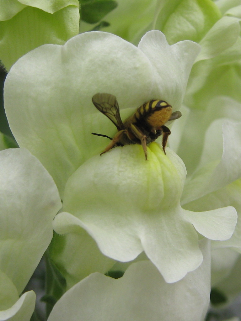 They’re called Wool Carders because the female take the fuzz off fuzzy leaves to line their nests. That part I haven’t seen yet. All I know for sure is they like snapdragons.