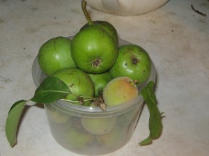 And over by the pear tree I found a bunch more pears on the ground. Did they drop off, or get dropped off? Someone else is waiting for ripe fruit, and they’re not finding it either.