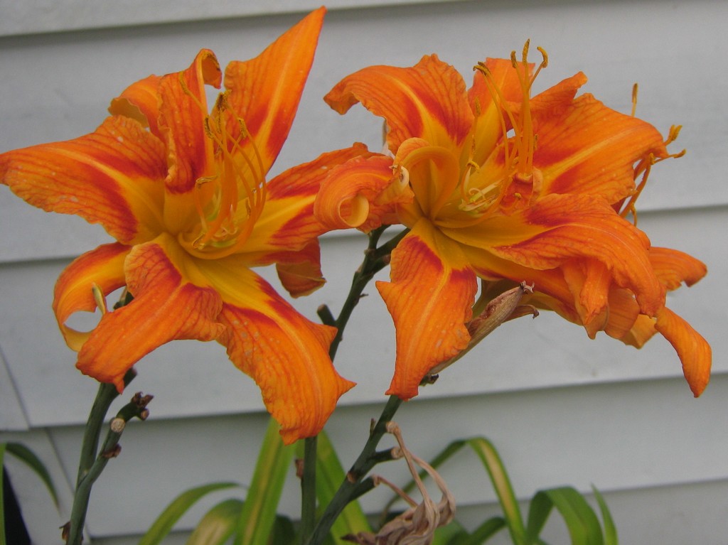 It’s high summer and the daylilies are flowering. There’s orange ones and yellow ones but mostly these red-throated curly orange ones. Since each flower drops off at the end of the day, you’ll never see these two again. You might see their like, though.