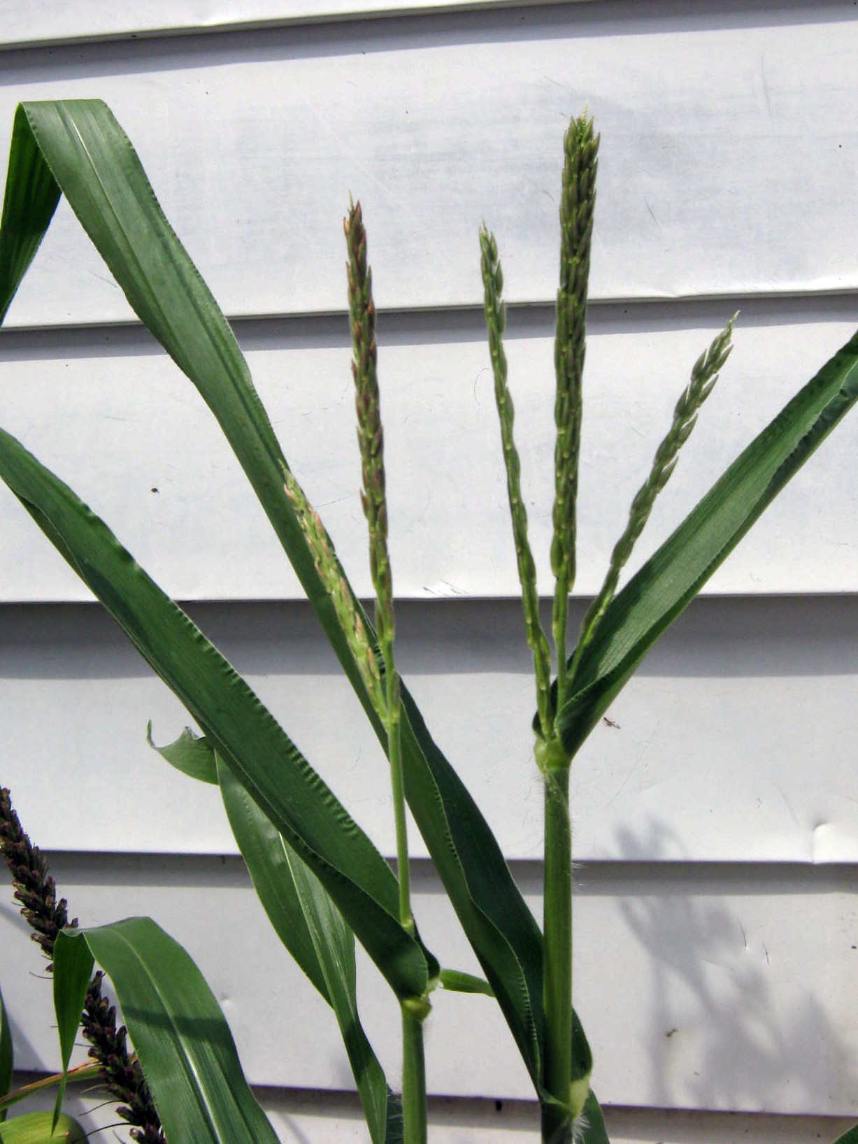 Two unusually tall grass plants have unveiled two flowering stalks. There’s even a couple of skinny ears forming at the bottoms. It’s corn! No way will anything come of this, but let’s see how far they get.