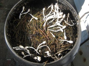 Mushrooms sprouting in compostLooks like my compost tumblers have gotten past the stage where I open them up and check to see if it’s composting. If it’s dry, I add water. If it’s stinky, I add leaves. If it’s full of mushrooms, I jump back and say, Wow! You never know what you’re going to find!