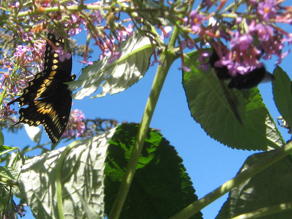 There’s nothing quite like the clear weather that comes after a good storm. The sky seems extra blue, urging you to look up. That’s how I saw a kettle of hawks migrating this morning. Five or six hawks were wheeling around each other, steadily moving in a southerly direction. The bees were back to business as usual, including the Carpenter Bees in the butterfly bush. Plus, an actual butterfly paid a visit: a big, fluttering Black Swallowtail.