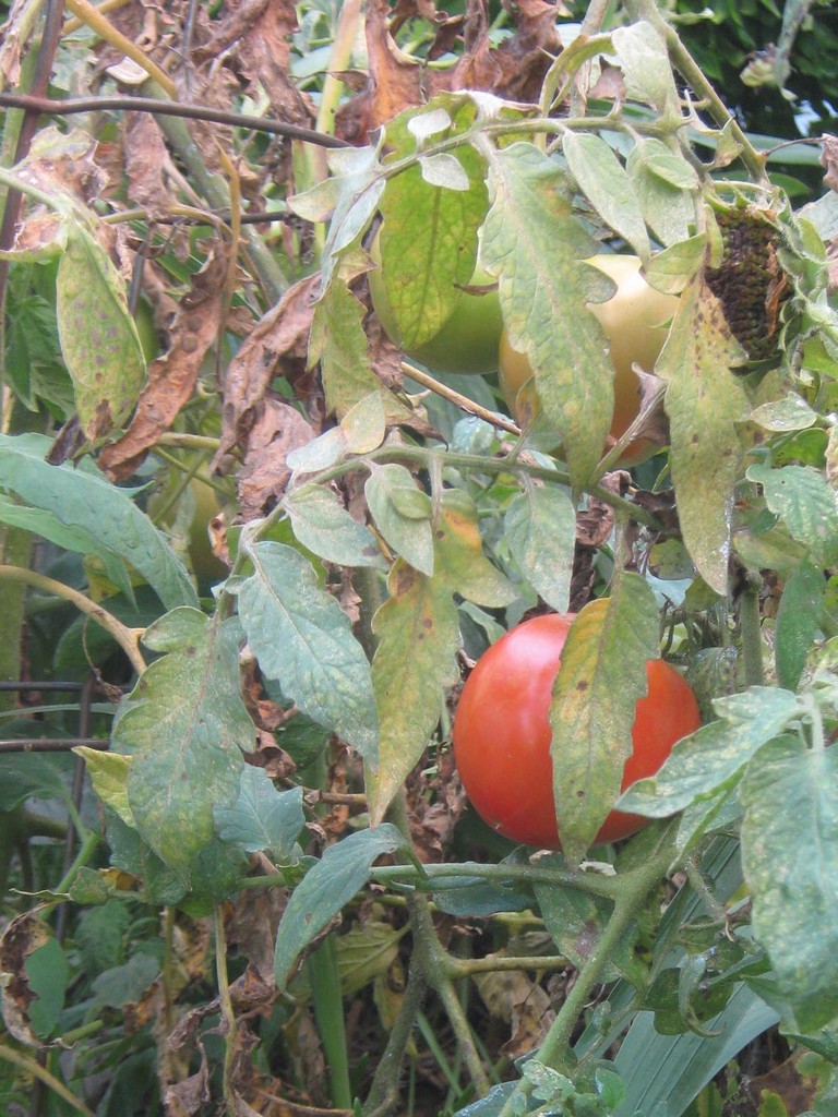 The rate of tomatoes ripening has fallen from three at a time, to one at a time. But as the weather cools and the days shorten, I don’t expect to get any more ripe tomatoes at all. So this might be one last gift from my tomato plant. Never mind how dead half of it looks. It’s still alive, still growing, and it thinks it’s going to go out for a walk.