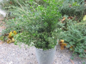 I swear I cut off huge fistfuls from the thyme plant, but it’s still so massive, it doesn’t look any different. Now the stems are stacked up in the food dryer, and the whole house smells like the best stew ever. There’s plenty more thyme where that came from.