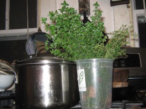 I keep forgetting that I have parsley still growing in one corner of the herb garden. In the mean thyme, there’s a plant that seems determined make sure there is no parsley left to forget about. So with a mighty snoop of my scissors, I cut off a wave of thyme. Thus, the latest harvest. I hope it’s enough to season the brine for the turkey.