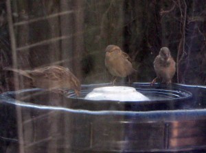 I love seeing the birds swoop in for a drink before the water even stops steaming. Too bad I didn’t get a better picture this time. Feel free to speculate about the nature of the ladder-like object being reflected in the window.