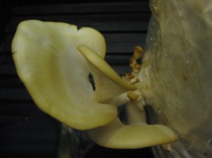 So this is the third flush of oyster mushrooms that I’ve harvested. The photo ought to give you a good idea of how the first flush looked: a little dried out around the edges.