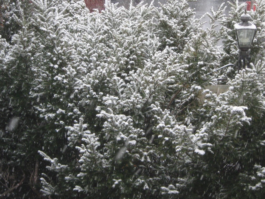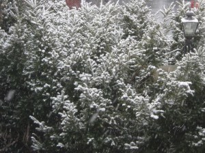 It’s snowing! For real snowing going-to-fall-until-tomorrow-morning snowing. Just now, it’s in the stage where it’s sticking to branches and looking pretty. It’s particularly nice on evergreens with that dark green and white contrasty thing going on. The ground is warm enough, so it’s not sticking to the paths yet. Yet.