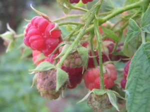 Raspberries are backI finished eating the raspberries from the first season about a couple weeks ago. These are the second wave that comes from the fallbearing raspberries. They are Heritage raspberries, and they make big, cone-shaped berries. Most of mine are growing under the butterfly bush, and I think they pick up some of the dusky fragrance of the flowers. So nice!