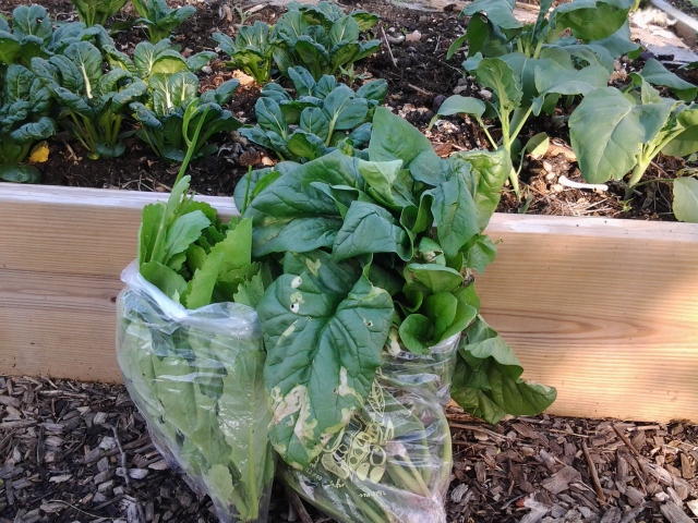 At my community garden plot, I harvested another pound of Chinese mustard greens, and a couple pounds of spinach, slightly sun-burnt. And planted some green beans. By then, it was too hot to pick a random packet to sow, but the spinach was growing in all sorts of random spots, so that has to do.